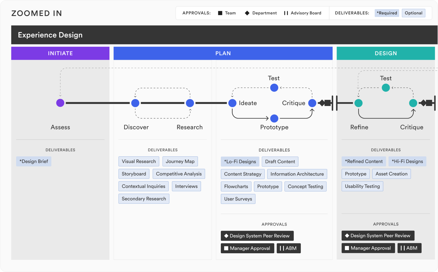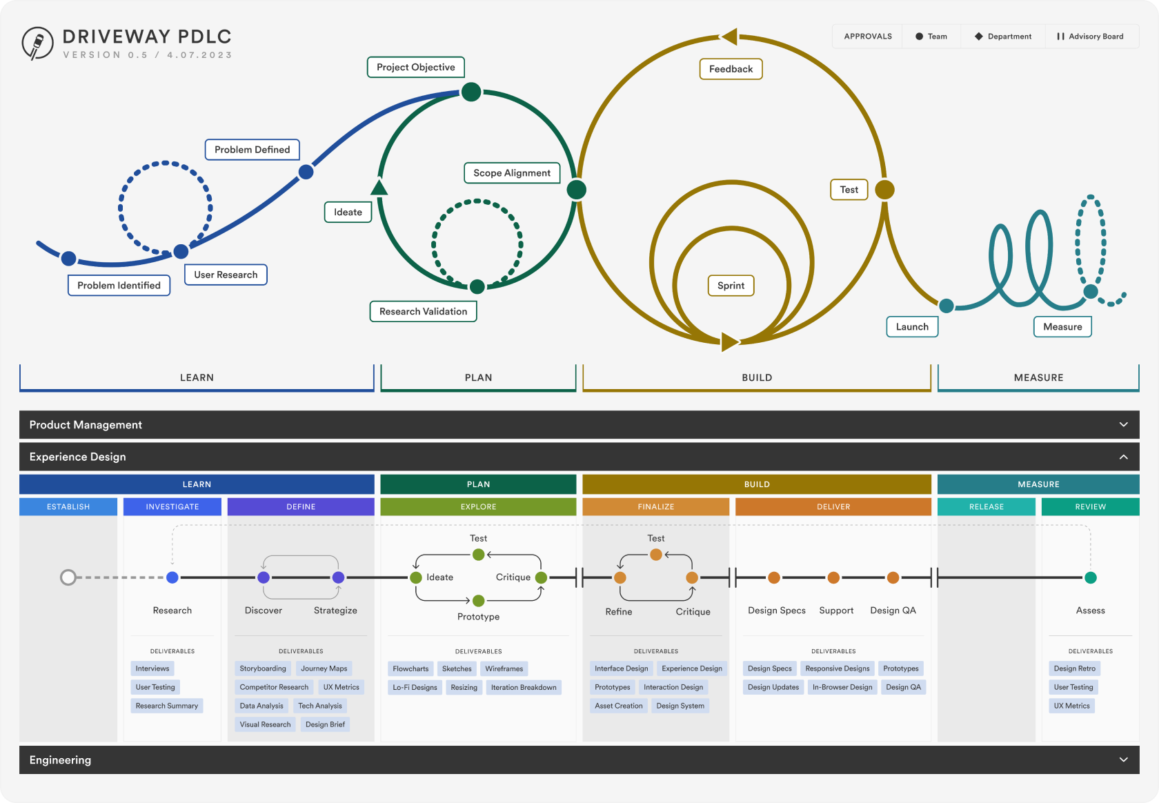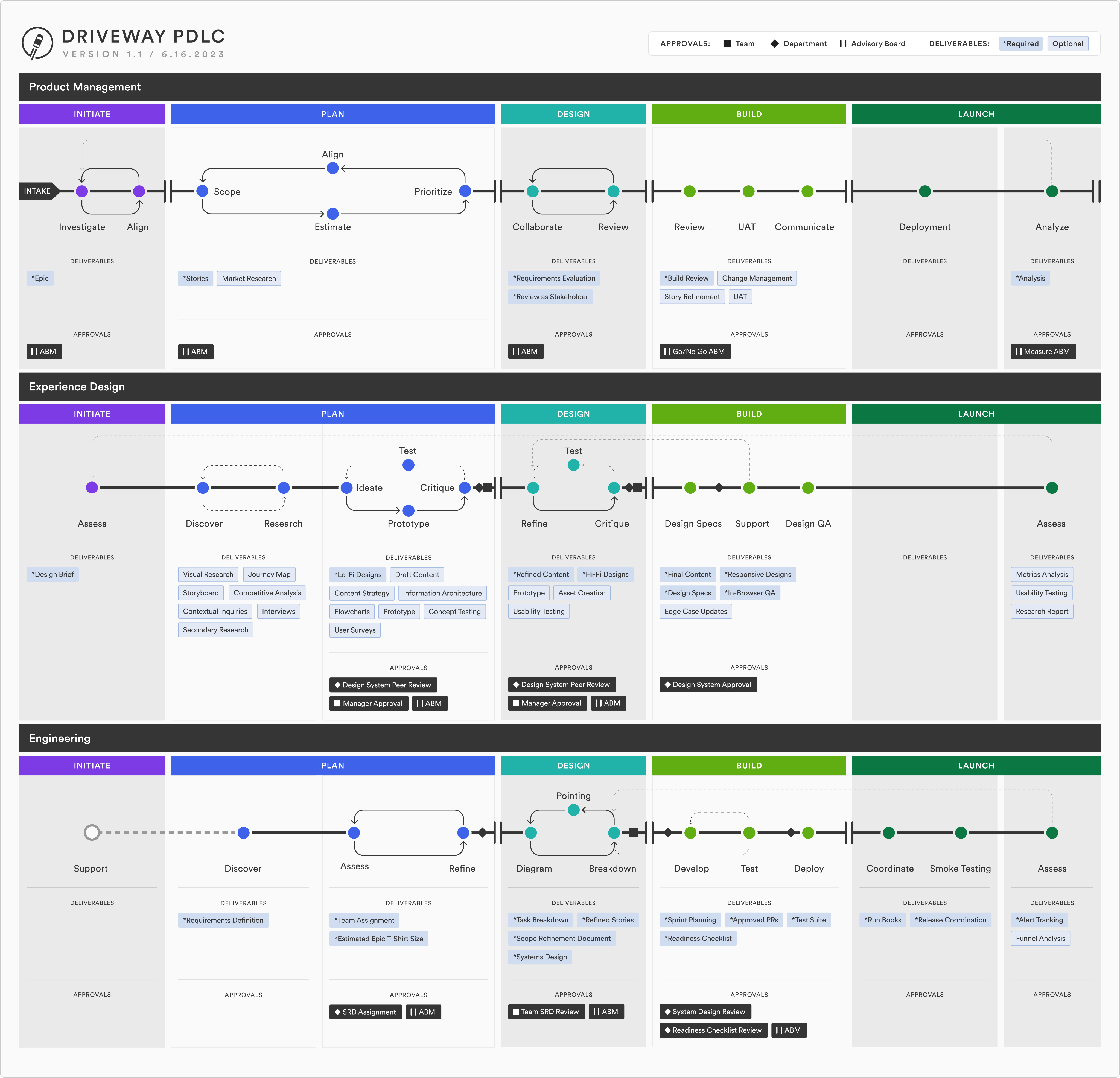 Stuck in the cross hairs of a new design director looking to understand and document our cross-functional workflow, I mediated feedback from managers and directors across design, product management, and engineering, to build the below product development lifecycle charts for the business to align around.