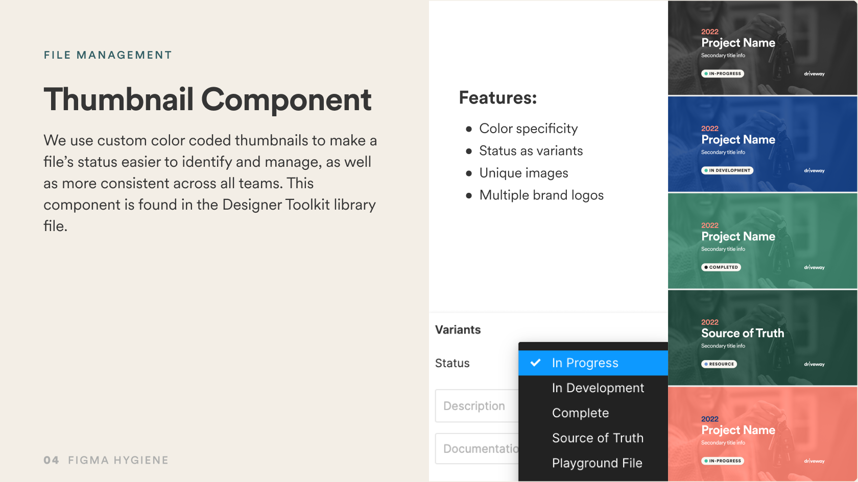 As the team grew to 35 designers, inconsistent Figma organization began to hinder visibility. I partnered with Principal Designer Derek Shirk to research internal workflows and identify best practices. We developed a comprehensive standards guide and a custom component toolkit to drive consistency and efficiency in file management across all teams.