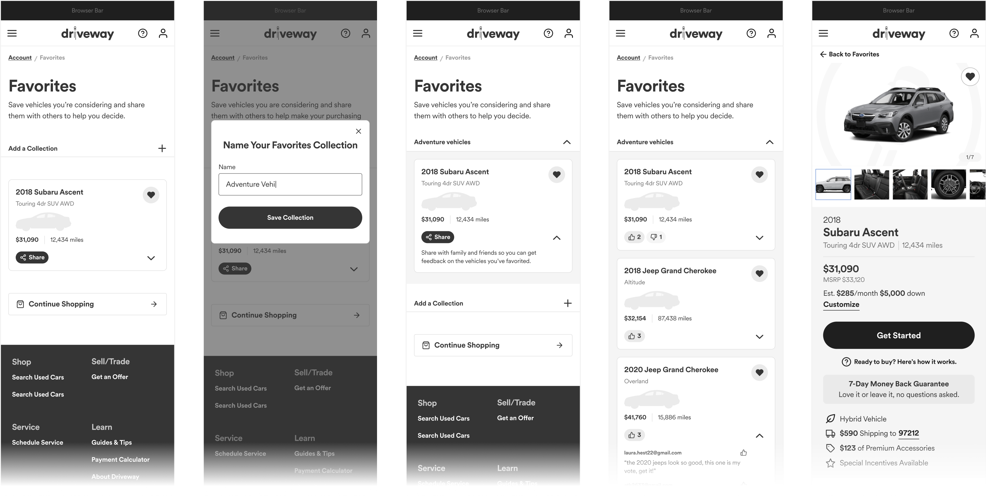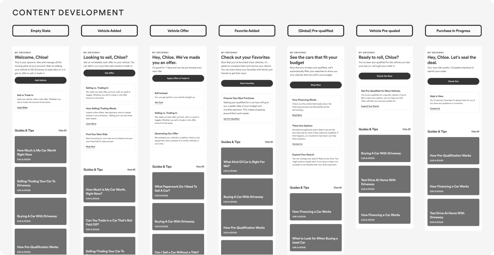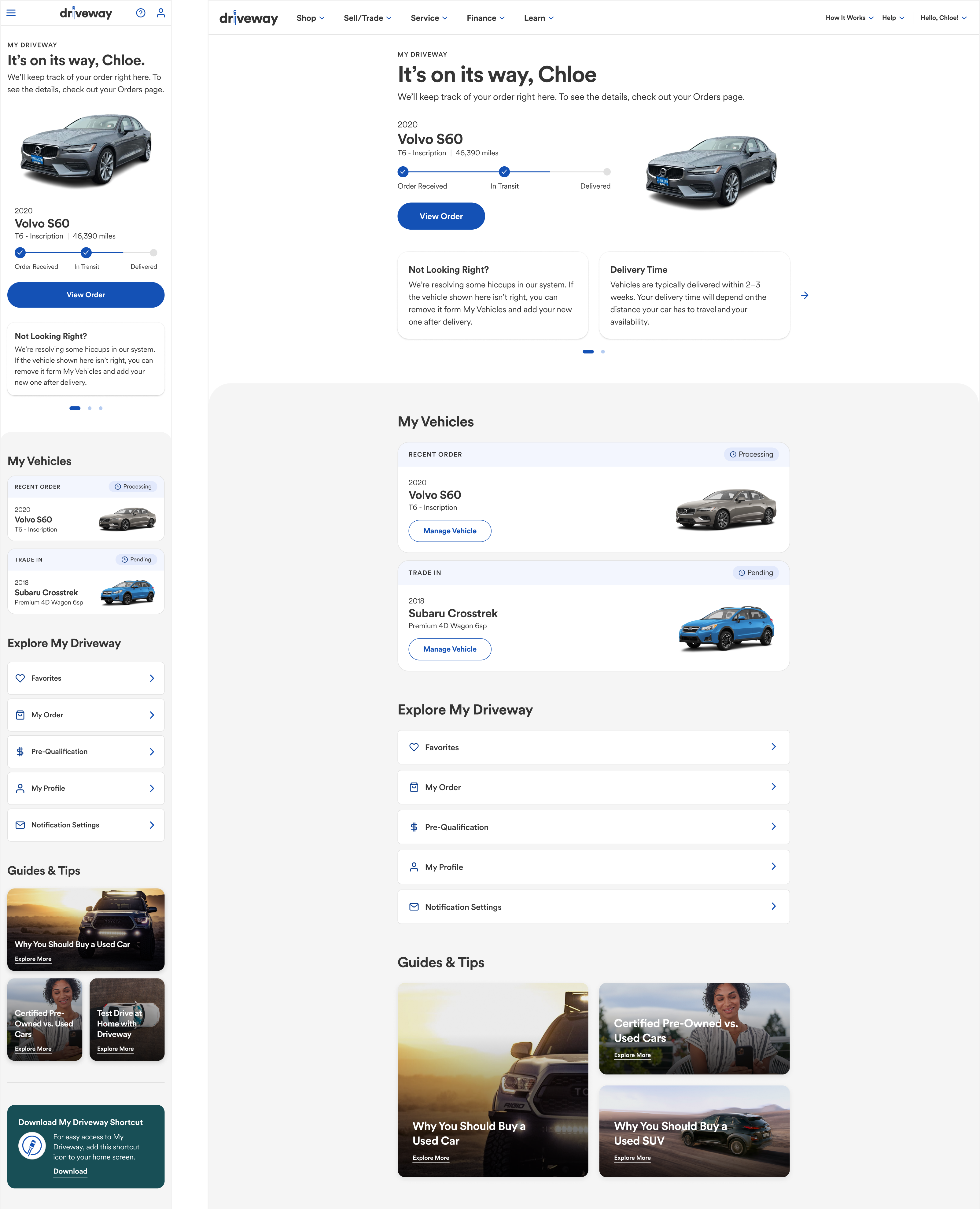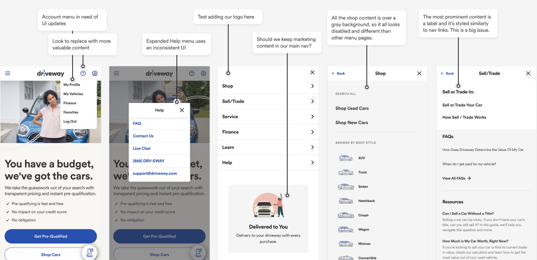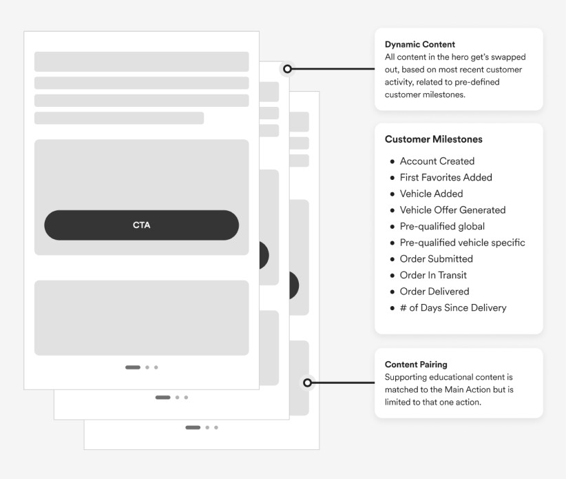 The dashboard view was a new idea we pushed for. It would feature the customer’s vehicle and recommended actions. If no vehicle existed, it would motive the user to add one for getting a buy back offer or service management.
